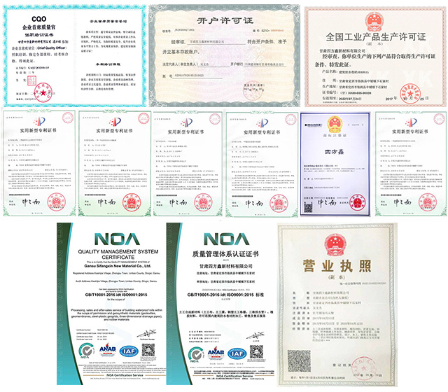 公司自成立初,就致力于高起点规划,高水平设计,高水平管理,高水平的科研队伍,顺应国内国际化纤市场的潮流,不断推陈出新,更新换代,迎合了市场,满足了消费者的需求,取得了消费者的信赖。其产品有:各种止水带、止水条、橡胶支座、EVA防水板、EVA含量>5%防水板,各种高档针刺土工布、PE. EVA土工膜、HDPE、LDPE防水板、复合土工膜、塑料单、双向土工格栅、经编格栅、钢塑格栅、土工格室、三维固土网垫、复合防水板、塑料盲沟等多种土工材料并现有特幅宽6.0米宽土工布生产线三条,日产土工布( 100克-800克) 10万m', 6.4米宽复合土工膜生产线两条,日产复合土工膜(一布一-膜,两布一膜克重250-300克) 16万m', 8米宽PE膜防水板生产线两条,日产PE膜防水板( 0.1mm-2.0mm ) 60吨, 6.2米宽防水毯生产线-条, 日产防水毯1万m,6.2米格栅生产线-条,日产格栅1.5万m',产品广泛用于公路、桥梁、水库、隧道、尾矿坝防渗处理、铝厂赤泥堆防渗工程、盐湖防渗工程、垃圾填埋工程以及污水处理隧道防渗和堤坝建设等工程。我公司参与了多项国家大型工程建设,受到了各界的- -致好评。甘肃四方鑫新材料有限公司已通过IS09001质量管理体系认证和ISO14001环境管理体系认证。拥有当前国内先进的设备,大批高素质管理、营销、技术人才的本集团公司进一步实现持续、 健康、快速的发展提供更大的保证,我们的宗旨是:以质量求生存,以信誉求发展。